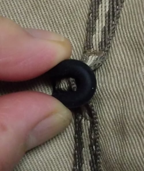糸留めボタンの場合は、ボタン中心部の生地に力がかかりますが、パラシュートボタンの場合は、ボタンの外側のテープ部分が衣服に縫い付けられているため、生地の広い部分に力が分散します。